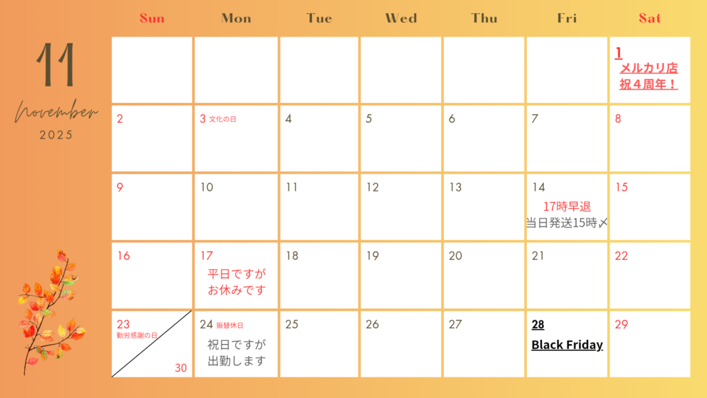 ②11/15(土)~11/17(月)まで3日間 販売担当不在です